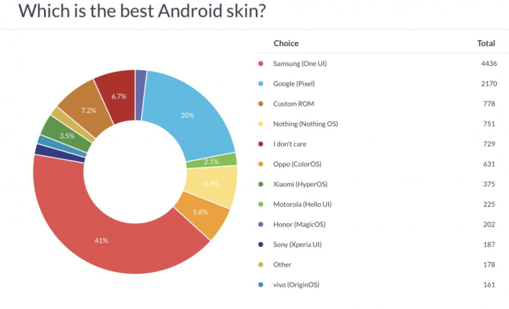 Di posisi kedua, ada Pixel UI milik Google dengan perolehan 20% suara. Ini menarik, karena hanya Samsung dan Google yang berhasil menembus angka dua digit (di atas 10%). Sisanya? Harus puas berbagi kue yang lebih kecil.